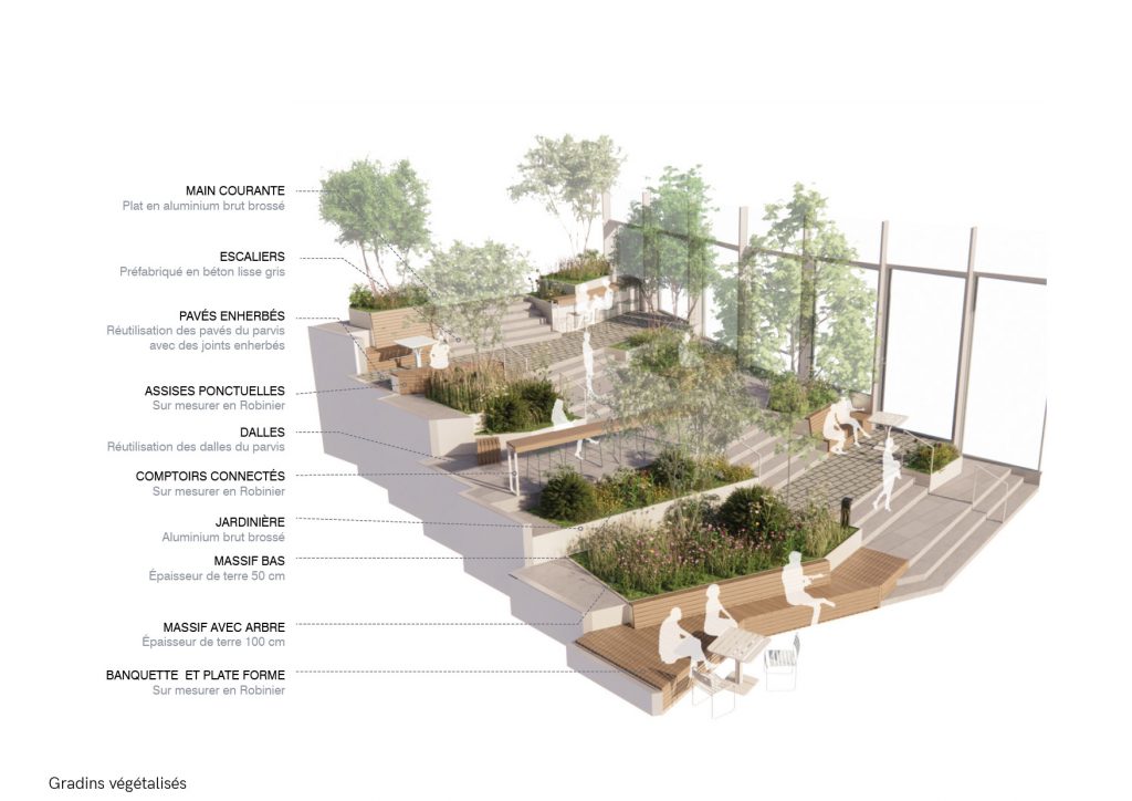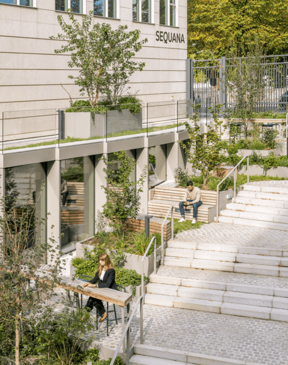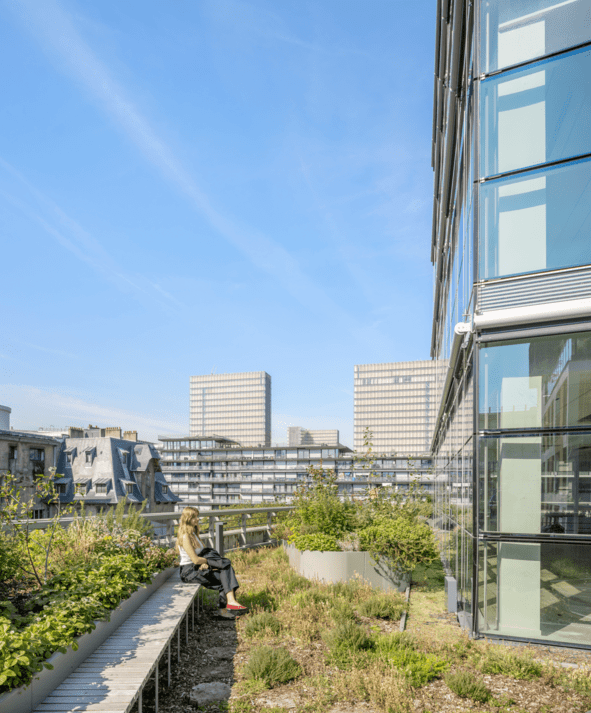 Les terrasses, longtemps non valorisées, deviennent ici des lieux de vie en pleine hauteur. Leur végétalisation importante, pensée selon les expositions et les capacités structurelles, les transforme en îlots de fraîcheur. Le travail paysager privilégie des ambiances où l’on peut à la fois se reposer, travailler ou simplement profiter des vues sur la Seine et la ville.
