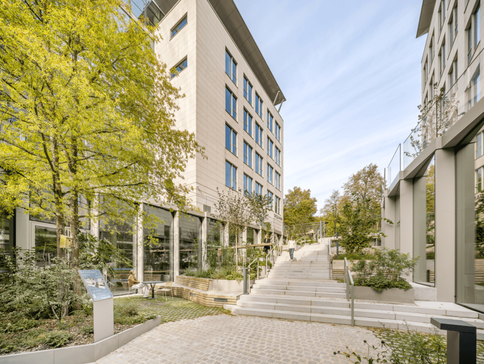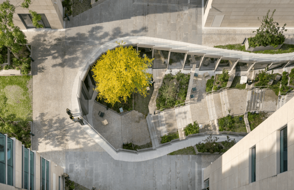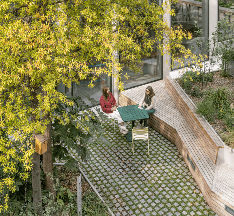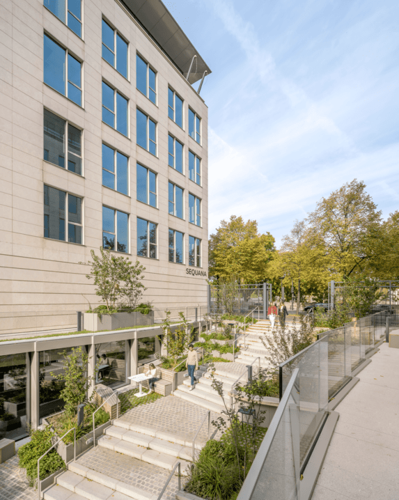 Cette approche se prolonge jusqu’au rooftop, aménagé comme une plateforme panoramique pouvant accueillir un usage événementiel tout en intégrant des plantations légères. L’ensemble du projet, du rez-de-jardin aux toitures, est traversé par la même ambition : créer des espaces extérieurs vivants plutôt que des décors. Le paysage devient alors un prolongement naturel des lieux de travail, un lieu de bien-être et un vecteur de biodiversité dans un tissu urbain dense.