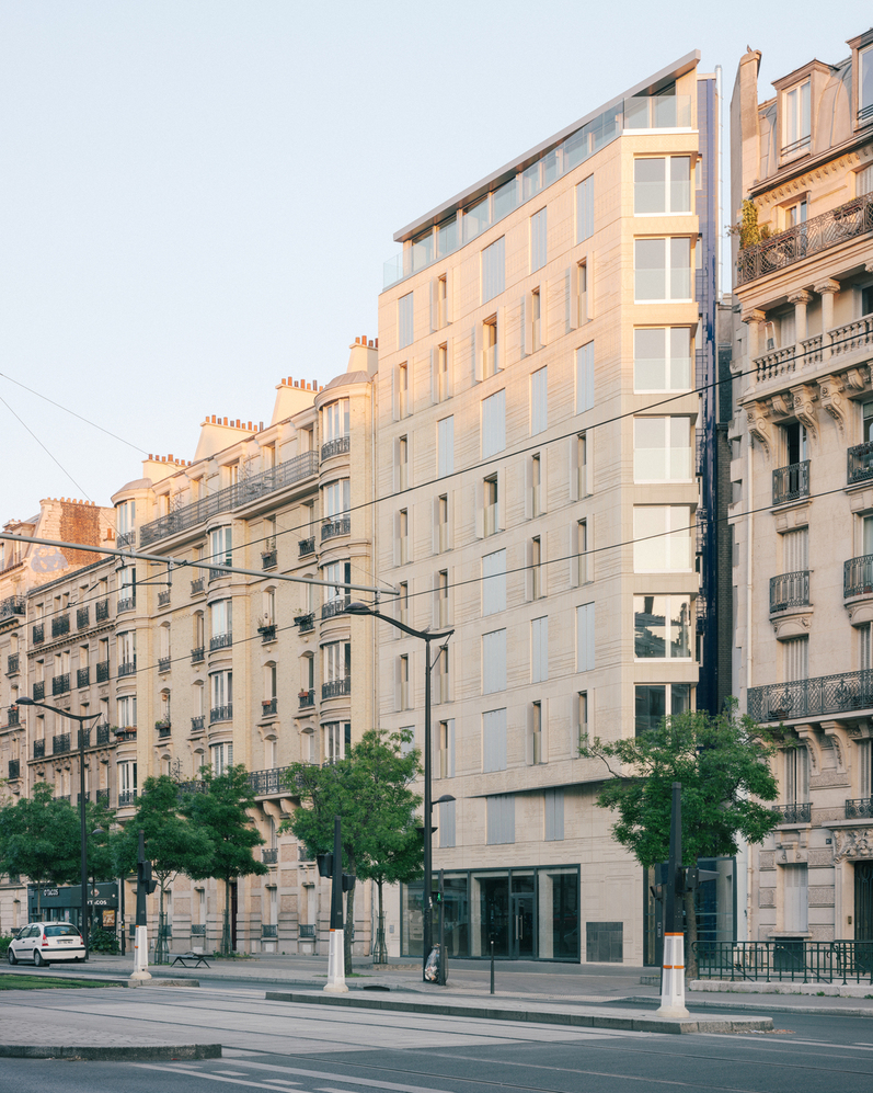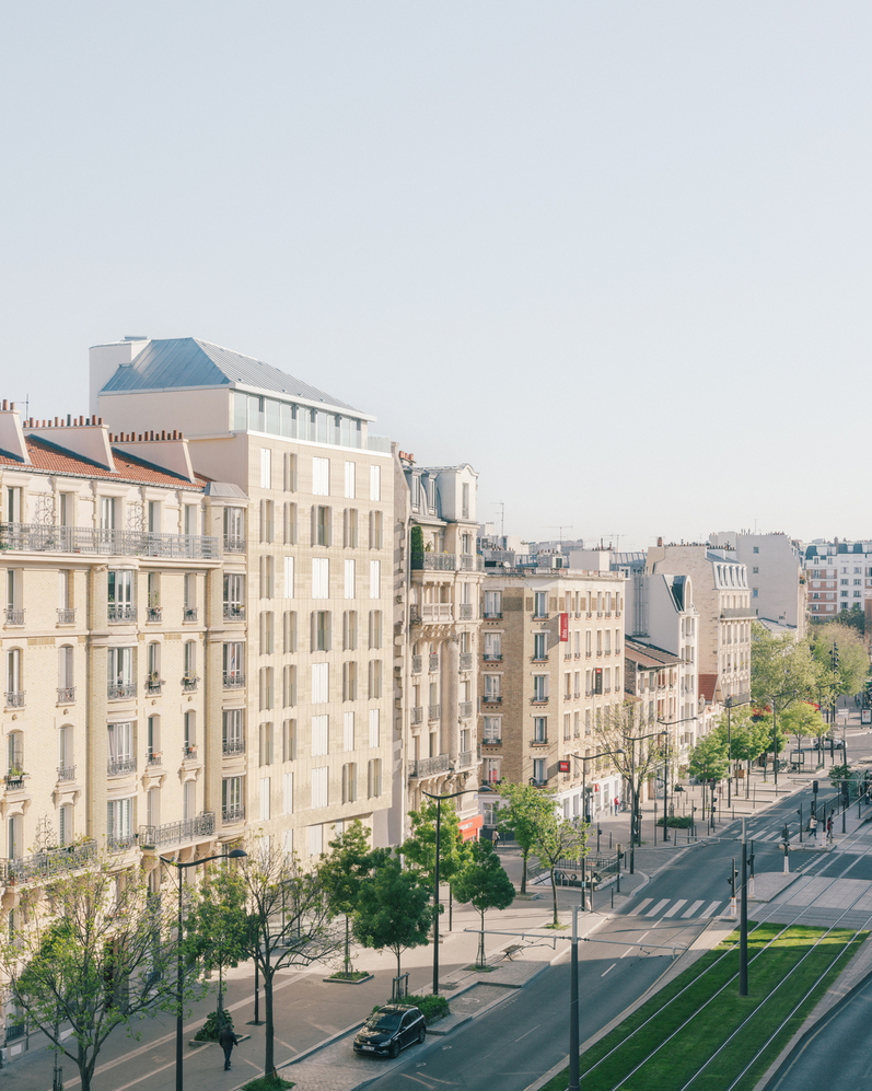 L’écriture architecturale de ce projet est différente des immeubles voisins mais s’inscrit dans une échelle commune à ce boulevard. Elle participe à la formalisation de cet espace public dans une démarche cherchant contextualité et urbanité, persuadée que l’approche de l’esprit d’un lieu ne peut exister que dans la justesse du rapport de la plus petite partie à l’ensemble.