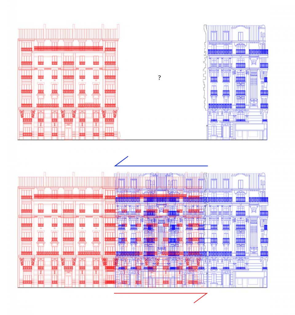 Ces deux petites maisons, anachroniques par leurs échelles par rapport au tissu environnant, ont laissé par leur persistance cette brèche ouverte, une irrévérence à la logique et à la pensée du XIXe siècle, où façades ordonnancées et espace public participent, de manière concomitante, dans un rapport direct entre plein et vide, à l’expression d’un boulevard parisien de cette époque.