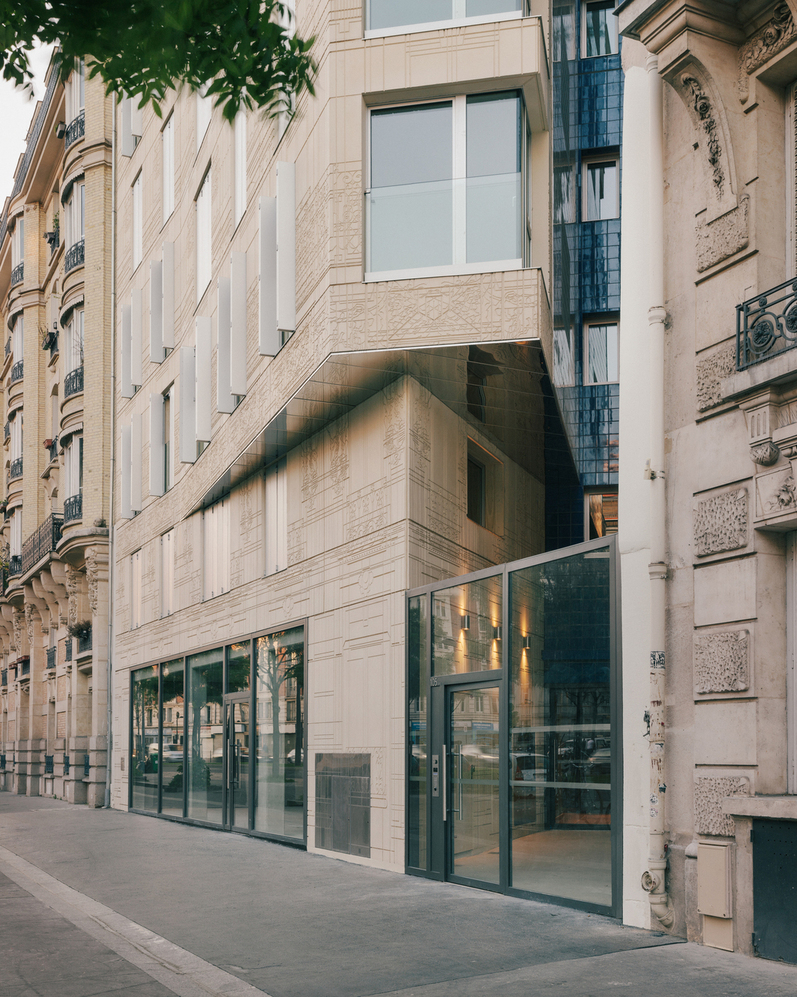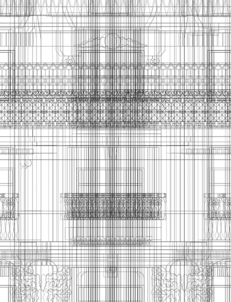 Le projet joue sur l’ambiguïté entre matière et ornement en travaillant avec un béton matricé sur l’ensemble de la façade. Par un travail de superposition et de multiplication des dessins des façades des immeubles voisins, la façade trouve un nouvel ornement dans sa matière même, où une multitude de lectures sont possibles : de loin on ne perçoit qu’une vibration, de près on commence à reconnaître certains motifs, puis en se déplaçant ils disparaissent pour redevenir une matière vibrante.