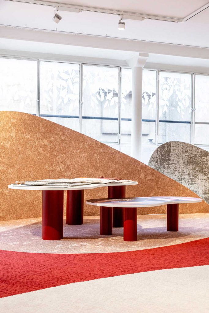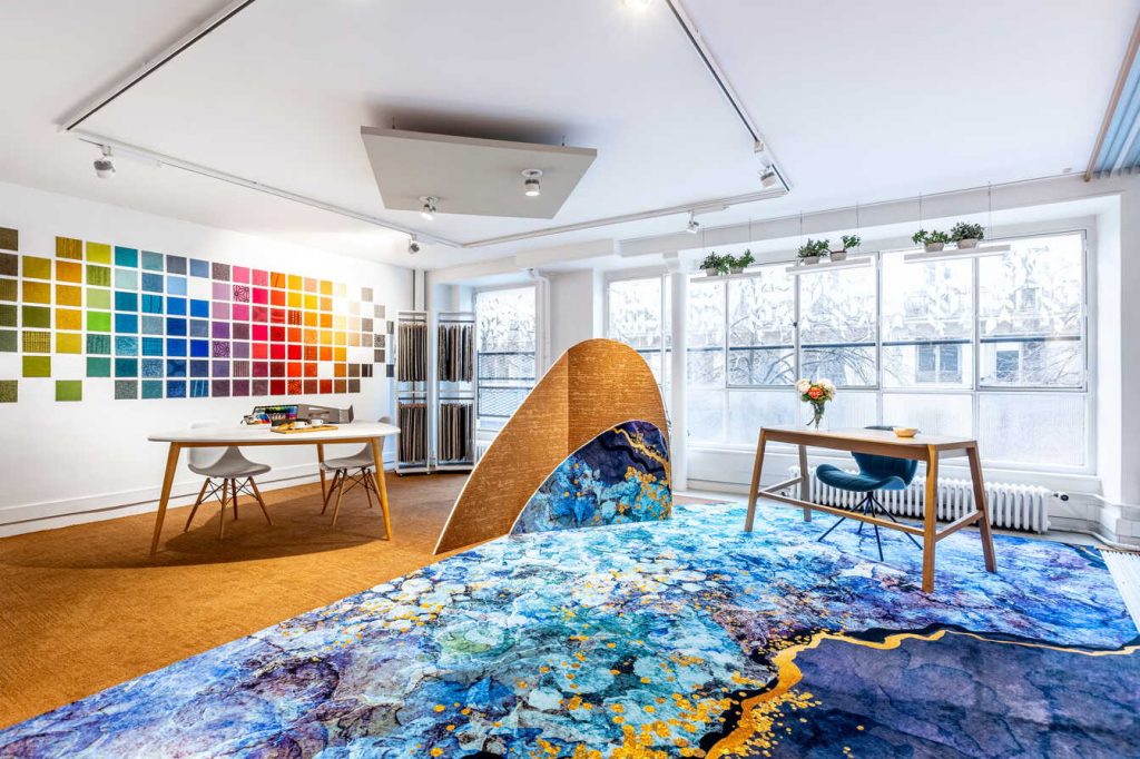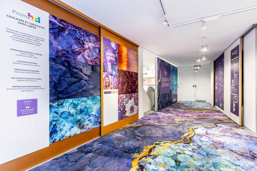 L’ensemble se déploie comme un dispositif de recherche appliquée. Au cœur du parcours, la technologie Prisma HD introduit une précision nouvelle dans l’impression textile. Déployée sur le support Top Design 1100g Saxony, elle permet d’atteindre une densité chromatique et une finesse de dessin qui déplacent le statut du revêtement. Le sol quitte sa position de fond pour devenir une surface de projet, capable de structurer l’espace autant que les parois. Cette capacité d’adaptation, associée à une production ajustée, s’inscrit dans des logiques de conception où flexibilité et maîtrise des ressources s’imposent.