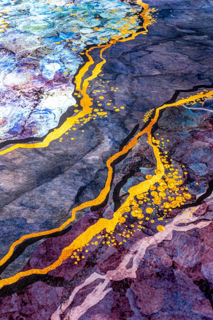 La première séquence installe un registre dense, presque nocturne. Le motif minéral, imprimé sur le fond de moquette Top Design 1100g Saxony, déploie des teintes profondes relevées d’effets métalliques. Sur grande largeur, il capte la lumière par éclats et organise l’espace autour d’une surface continue. Le sol absorbe les repères et engage le corps du visiteur dans une expérience immédiate, où la perception prime sur la lecture formelle.