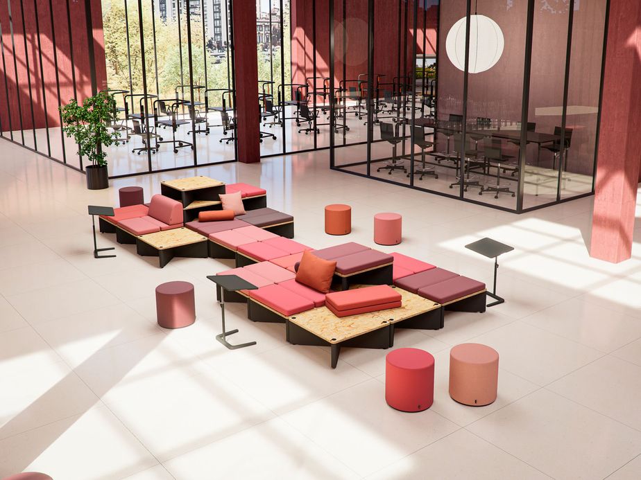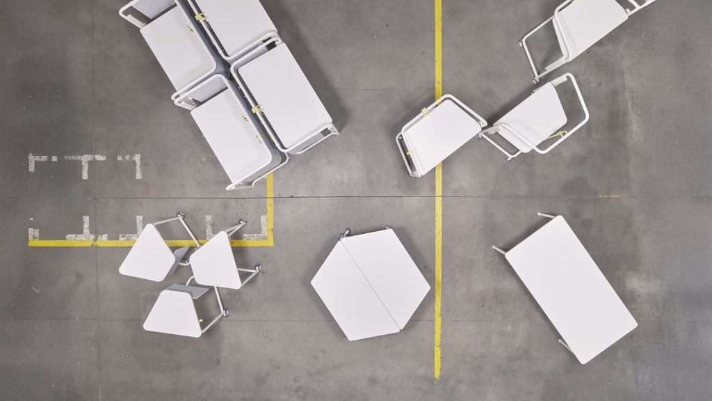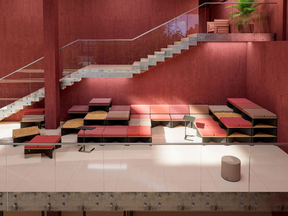 Les systèmes présentés traduisent cette orientation avec une précision constructive assumée. Reset, conçu par Stephan Hürlemann, repose sur des plateformes carrées de 75 cm de côté pour 28 cm de hauteur, constituées d’un panneau et de deux éléments de base. Quelques pièces de liaison suffisent à les assembler, les déplacer, les démonter ou les recomposer, sans planification préalable. Le dispositif permet d’investir des zones intermédiaires – couloirs, espaces d’attente – pour y installer des gradins, des forums, des îlots de travail ou des configurations plus informelles.