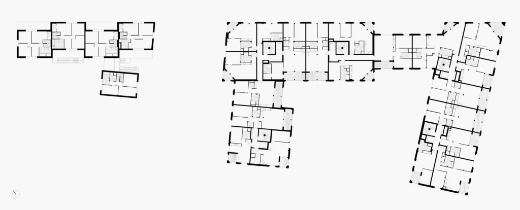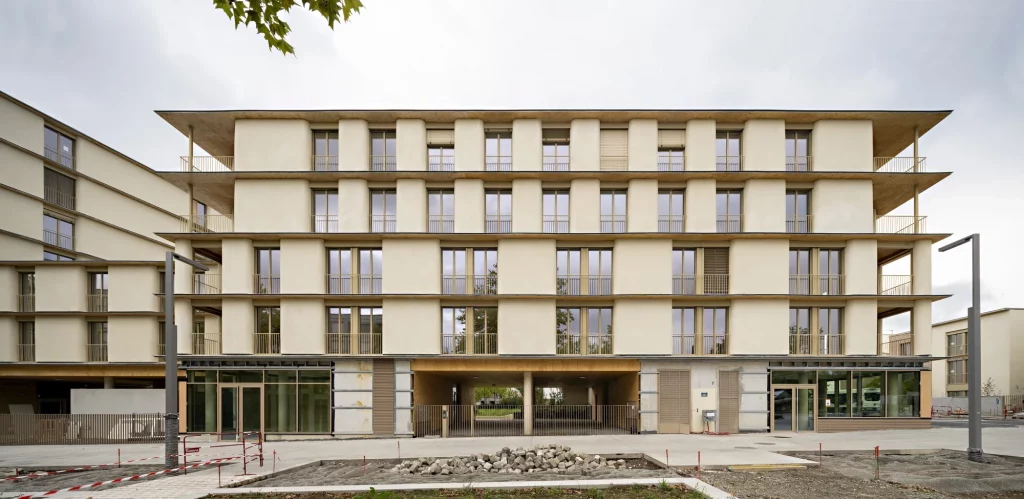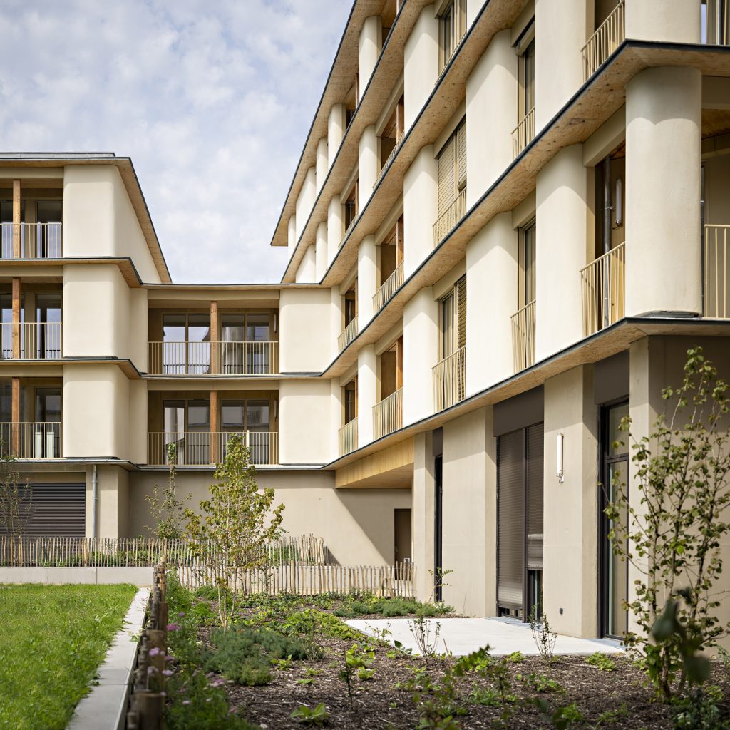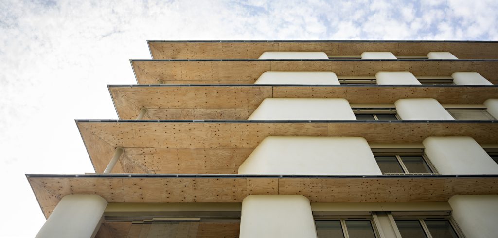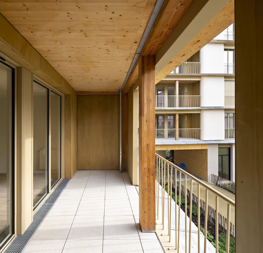 L’infrastructure, le rez-de-chaussée et les noyaux de distribution verticaux (escaliers/ascenseurs) sont réalisés en béton. Le reste des immeubles est construit en structure poteau/poutre/planchers/charpente bois. Si le bois est très peu apparent au sein des logements en raison des réglementations en vigueur pour des immeubles de cette envergure, les discussions avec le bureau de contrôle ont tout de même permis de garder une partie des poteaux apparents, et de réaliser les espaces extérieurs privatifs en bardage.