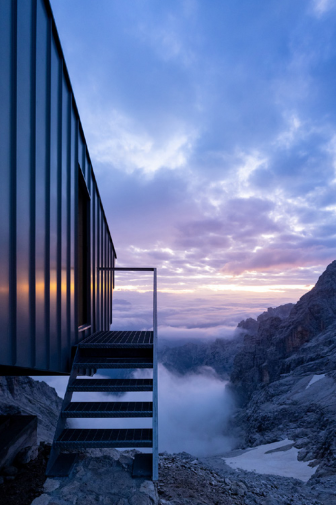 Le volume, façonné par le site, présente un profil fortement incliné, s’adaptant ainsi à l’orographie des Marmarole. Ce profil conserve toute sa puissance à l’intérieur du bivouac reliant ainsi le lieu à la vallée d’Auronzo.
