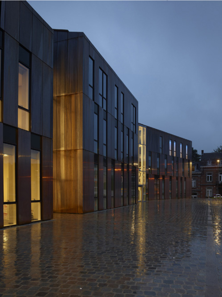 L’environnement urbain est transformé par cette interprétation contemporaine qui redessine les volumes en tenant compte de la logique profonde du site historique. Les matériaux et les teintes se fondent avec le bâtiment, tandis que les surfaces entièrement revêtues de cuivre naturel reflètent la lumière de Gembloux et réagissent aux conditions atmosphériques. Il en résulte un dialogue avec l’existant, offrant à la communauté un objet architectural singulier qui reflète l’identité de son contexte.