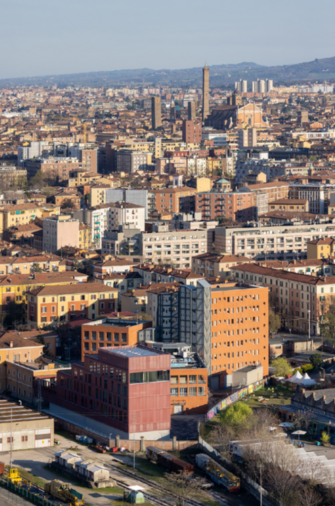 Ce projet s’inscrit sur un site isolé de la ville de Bologne, composé d’éléments urbains disparates, formant un espace résiduel hétérogène, encadré par des structures verticales : au nord, la ligne ferroviaire et la gare à grande vitesse qui composent un rideau continu d’infrastructures logistiques ; au sud, la zone dynamique du Centre Social et Culturel DumBo ; à l’est, la Via Tanari et les limites d’une ville multi-strate.