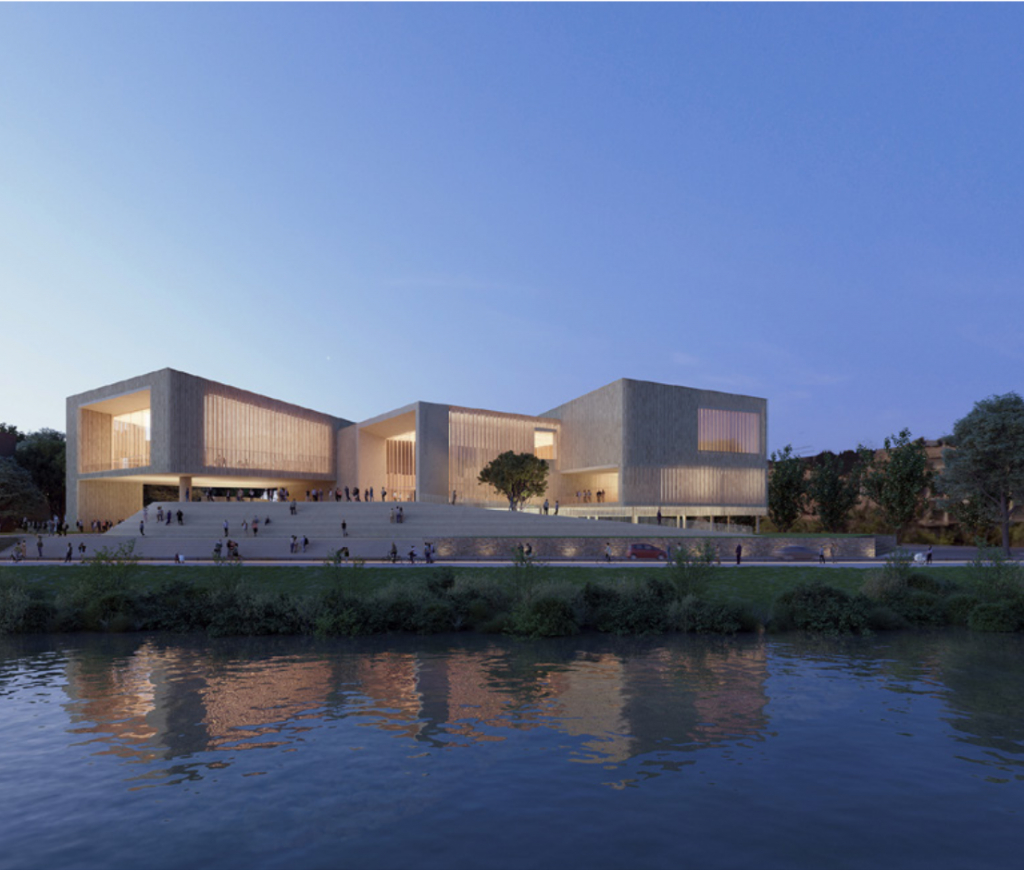 La nouvelle médiathèque de Carcassonne s’articule en plusieurs volumes visibles depuis le fleuve, offrant de multiples orientations visuelles vers le paysage et le tissu urbain environnant. Implantée dans un contexte fort, entre le square Gambetta et le front de l’Aude, la médiathèque se veut centrale, reliant les différentes entités du site, avec une architecture porteuse de sens et de continuité.
