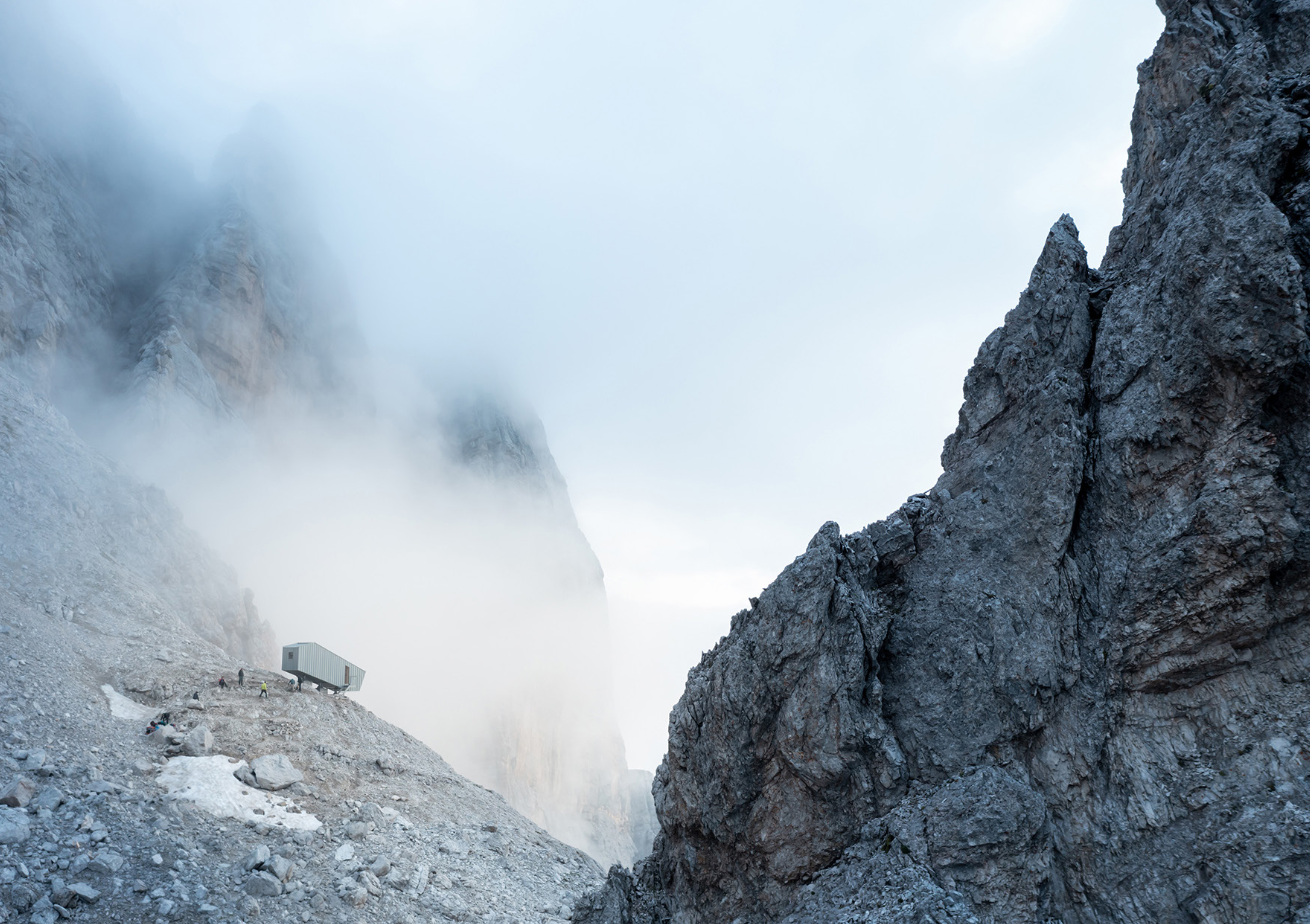 Le volume, façonné par le site, présente un profil fortement incliné, s’adaptant ainsi à l’orographie des Marmarole. Ce profil conserve toute sa puissance à l’intérieur du bivouac reliant ainsi le lieu à la vallée d’Auronzo.