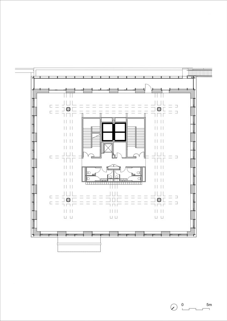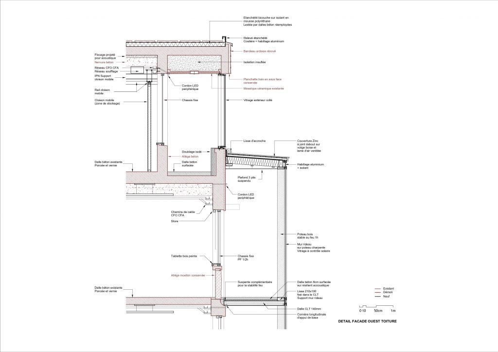 Destiné à accueillir un établissement d’enseignement supérieur, le pavillon est pensé comme une structure disponible. Les plateaux libérés, les faux planchers et la superposition des blocs techniques permettent d’anticiper des évolutions futures sans remise en cause majeure de l’organisation. La trame de façade, régulière et lisible, autorise des configurations multiples, laissant ouverte la possibilité d’autres appropriations. Cette capacité d’adaptation, inscrite dès la conception, traduit une attention portée au temps long du bâtiment, à ses transformations à venir autant qu’à son état présent.