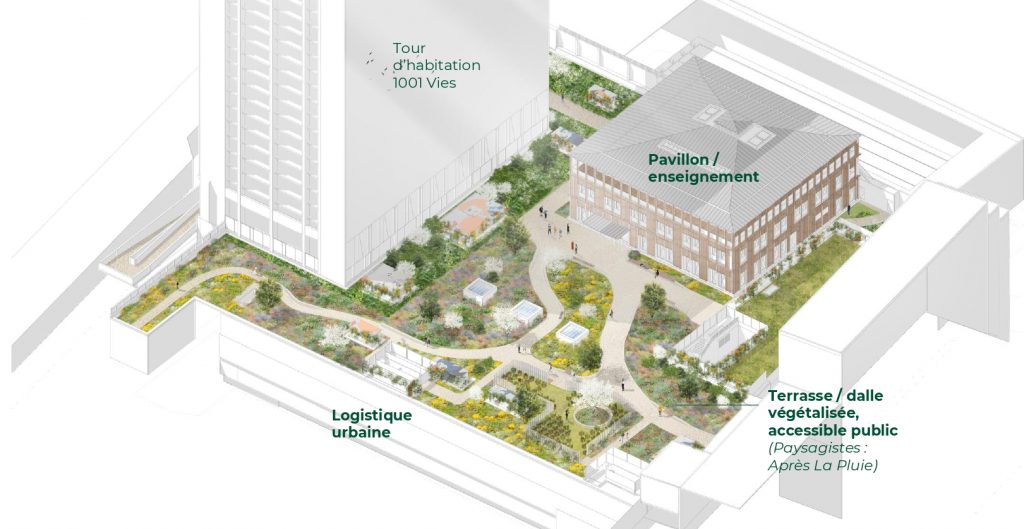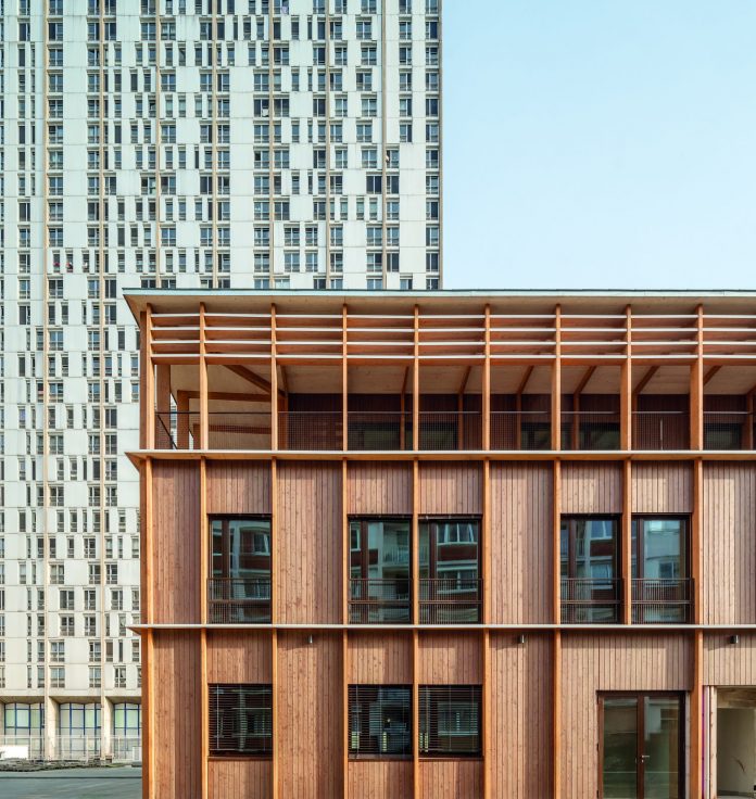 Édifié dans un ensemble conçu par Albert Grégoire pour le ministère des PTT, le pavillon Keller s’insère dans une composition urbaine caractéristique des grandes opérations sur dalle des années 1960. Ancienne crèche pour les familles de postiers, puis longtemps inoccupé, le petit bâtiment retrouve aujourd’hui une place dans un dispositif plus large mêlant logistique urbaine, espaces publics et programmation tertiaire. La réhabilitation s’articule avec la requalification de la dalle paysagée, ouverte sur le quartier et travaillée en concertation avec les habitants, dessinant un socle actif et traversant. Le bâtiment réinvesti trouve ainsi une position d’interface, à la fois ancrée dans l’existant et tournée vers de nouveaux flux. Jakub Jakubik explique : « Dès la phase de consultation, l’ambition environnementale était très forte, avec un recours massif aux matériaux biosourcés et au réemploi. Très vite, le site a révélé sa complexité. Un bâtiment singulier, posé sur une dalle peu portante, une structure concentrée sur quelques points d’appui. Cela a immédiatement déplacé le projet vers des questions très concrètes de constructibilité, de poids et de mise en œuvre, qui ont accompagné toute la conception. »