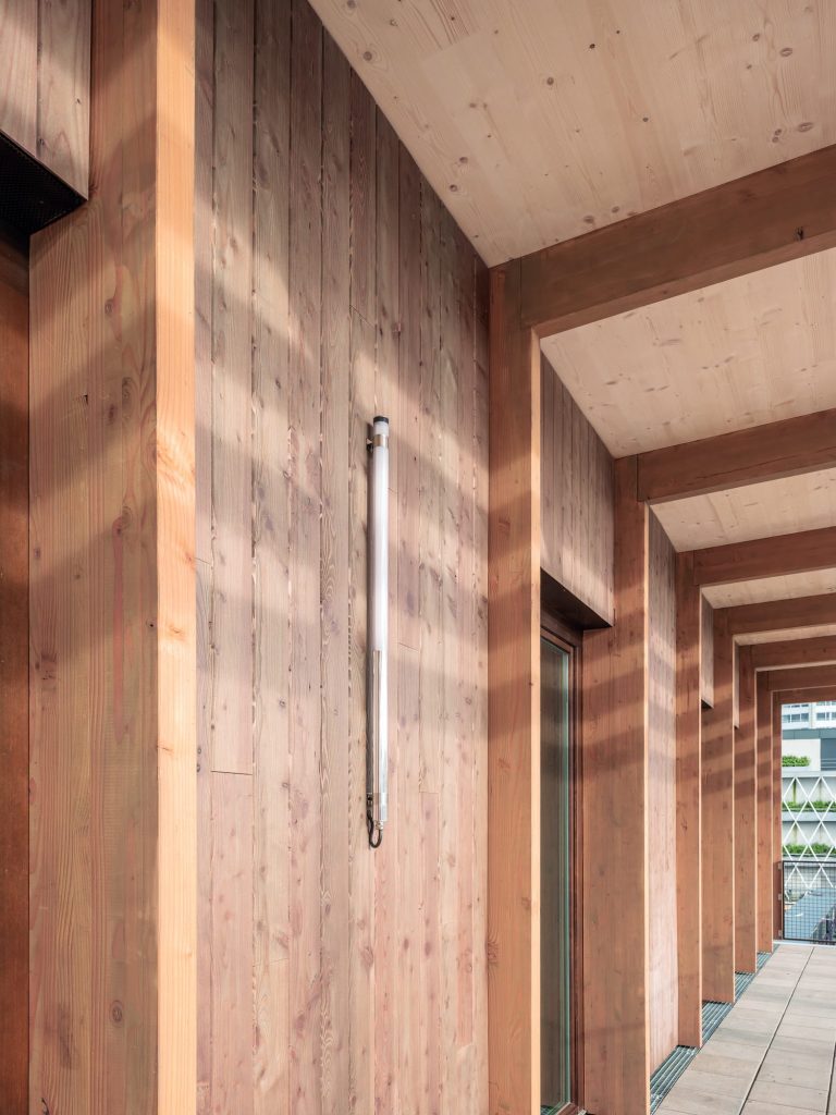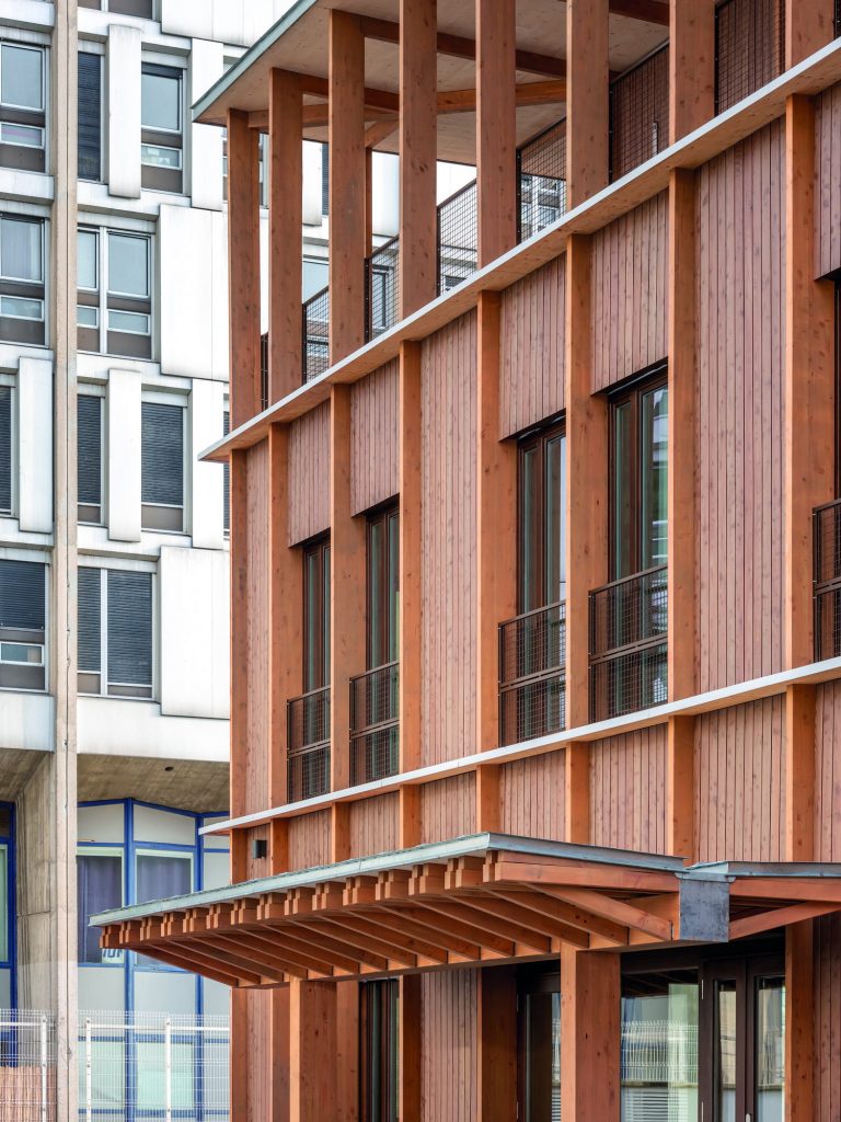 Le projet s’appuie sur une économie de moyens revendiquée. La structure en béton est conservée, comme une matrice capable d’accueillir de nouvelles couches. Autour d’elle, une enveloppe en bois pré-grisé vient recomposer la perception du pavillon, introduisant une matérialité plus chaude et un rythme vertical qui dialogue avec les façades voisines. Le chantier s’organise à partir d’un diagnostic précis des éléments récupérables, intégrant aussi bien des composants issus du site que des matériaux provenant de filières spécialisées. Cette attention portée au déjà-là relève d’un patient travail d’assemblage : « En ne conservant que la structure, nous avons dû reconstruire un langage architectural à partir de cette trame existante. Très tôt, nous avons cherché à prolonger ce rythme dans la façade et dans l’organisation intérieure. La dimension même des bottes de paille a participé à définir cette trame, créant une continuité entre le système constructif et l’usage des espaces. C’est ce jeu d’échelles, entre structure, enveloppe et plan, qui a progressivement donné sa cohérence au projet. »
