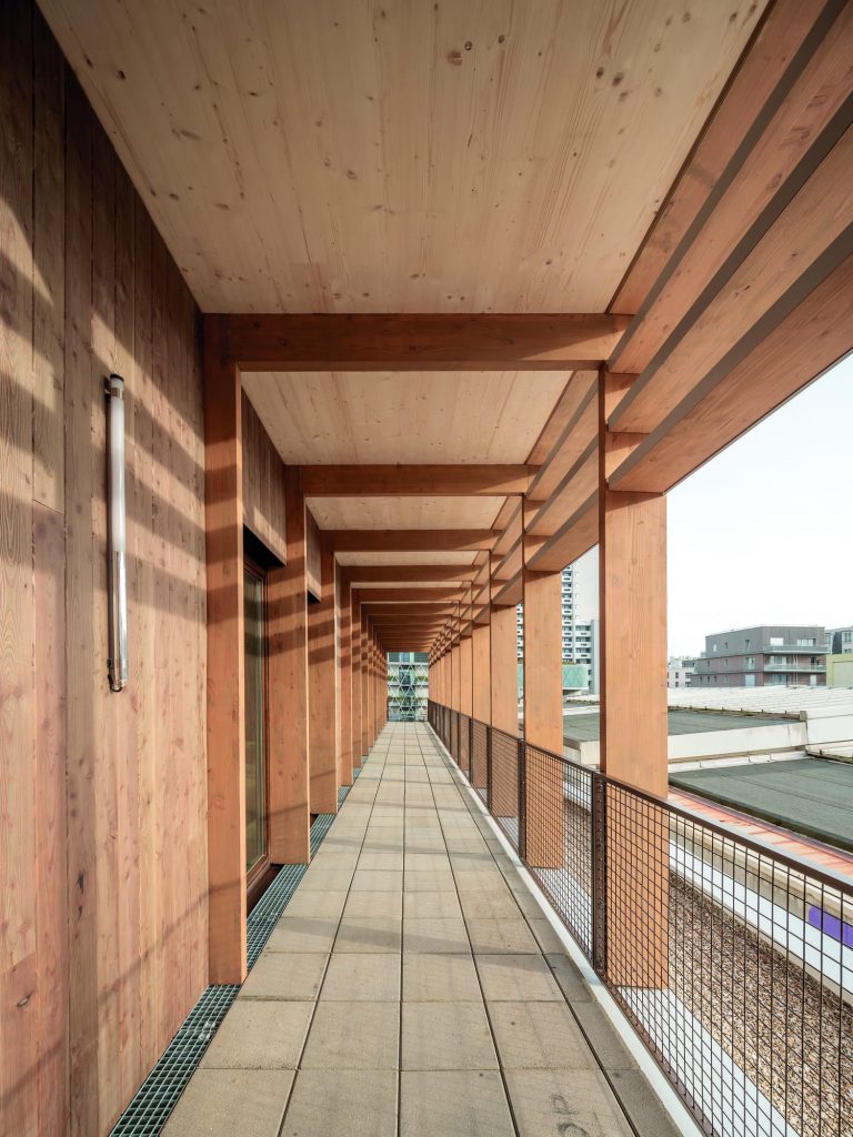L’enveloppe engage une réflexion fine sur les ressources et les performances. Isolants en paille et fibre de bois en façades, briques de terre crue en contre-cloison : le projet privilégie des solutions issues de filières locales ou recyclées. Les protections solaires varient selon les orientations, alternant dispositifs fixes et éléments mobiles, tandis que la ventilation naturelle participe de la régulation thermique. La toiture végétalisée prolonge cette approche en contribuant à la gestion des eaux pluviales et à l’atténuation des îlots de chaleur. L’ensemble compose un édifice où les choix techniques s’inscrivent dans une logique de continuité plutôt que de rupture.